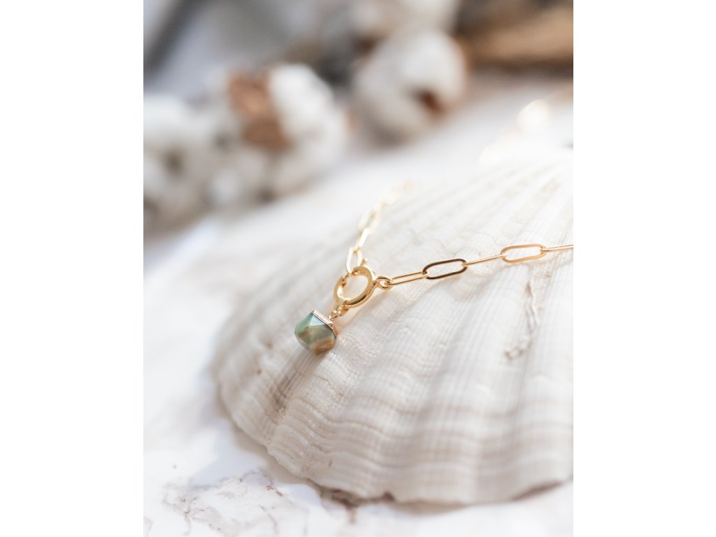 Náhrdelník z pozlacené mosazi s přírodním amazonitem. Dostupný též s labradoritem, onyxem nebo růženínem.